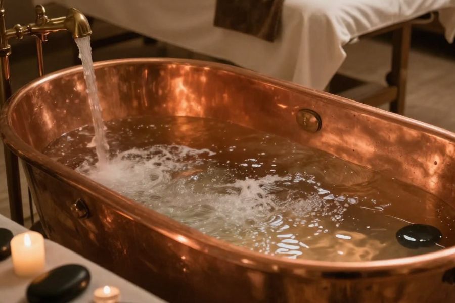 Plongez dans une baignoire en cuivre sur un lit de pierres, recevez une onction sacrée de gouttes d’huile chaude sur le front, puis laissez-vous transporter par un massage crânien, un gommage et un massage corporel aux pierres.